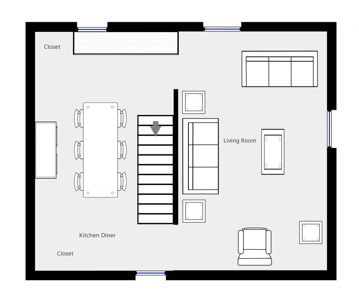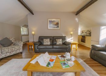 As you head upstairs you’ll arrive in open plan kitchen dining area, light and spacious there is lots of room to enjoy sociable family meals together. The well-equipped kitchen includes an electric oven and induction hob microwave, dishwasher and fridge/freezer. Just around the corner you’ll find the living area which is furnished with comfortable leather sofas, a coffee table and flat screen HD TV with Freeview and Blu-ray/DVD player, ideal for relaxing and planning the next days adventures.